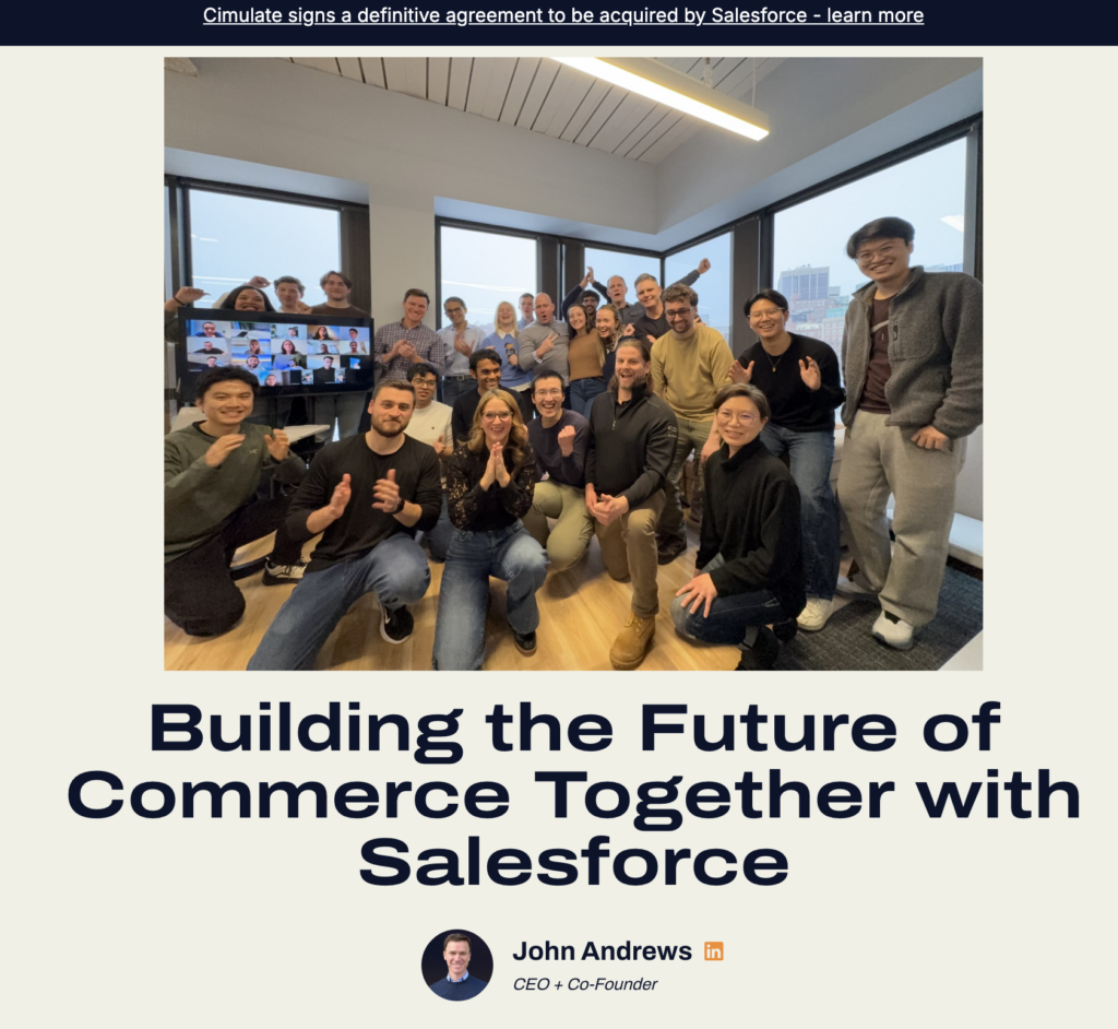 Today, I am thrilled to share that Cimulate has entered into a definitive agreement to be acquired by Salesforce. My co-founder, Vivek Farias, and I started this journey in 2023 with a clear mission: to move the industry beyond legacy, keyword-based search toward intent-driven discovery. This milestone reflects being in the right place at the right time with the right team and the right product as generative AI fundamentally reshapes the commerce landscape. – John Andrews, Co-Founder & CEO