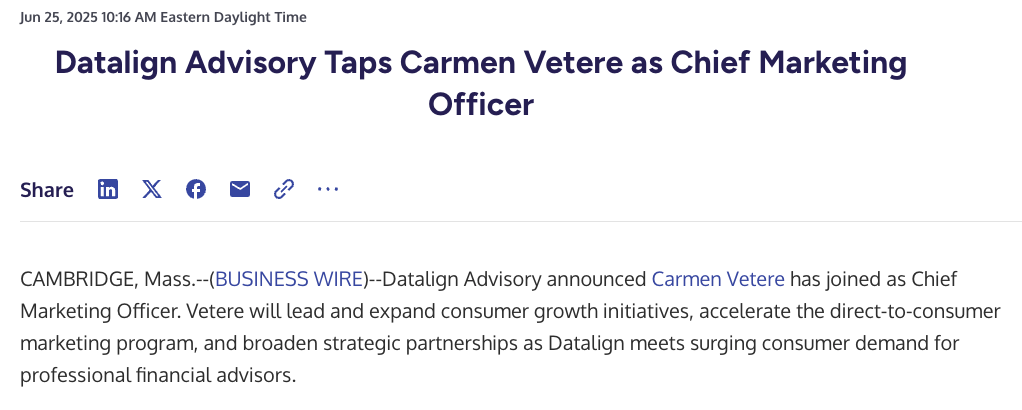 Datalign Advisory connects Americans with trusted financial advisors who can help them navigate life’s most important financial decisions. In an industry where finding the right financial guidance has always been a challenge, Datalign uses AI to fulfill its vision of perfect alignment between consumers and advisors. This team is leading an industry transformation to ensure that the right person finds the right advisor at the right moment, so every American has the money they need to live their best life and retire comfortably.